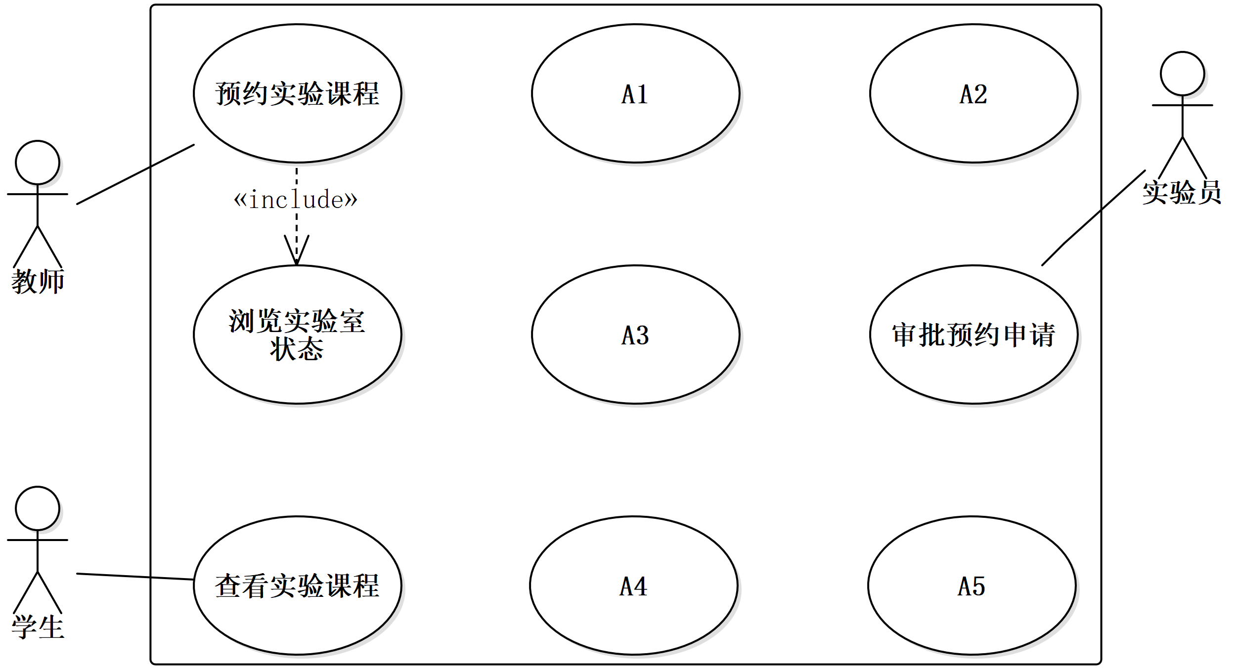 针对预约实验课程业务的需求描述,按照如图所示的结构重新绘制该业务的 UML ⽤例图,应补全缺失的⽤例或关系。