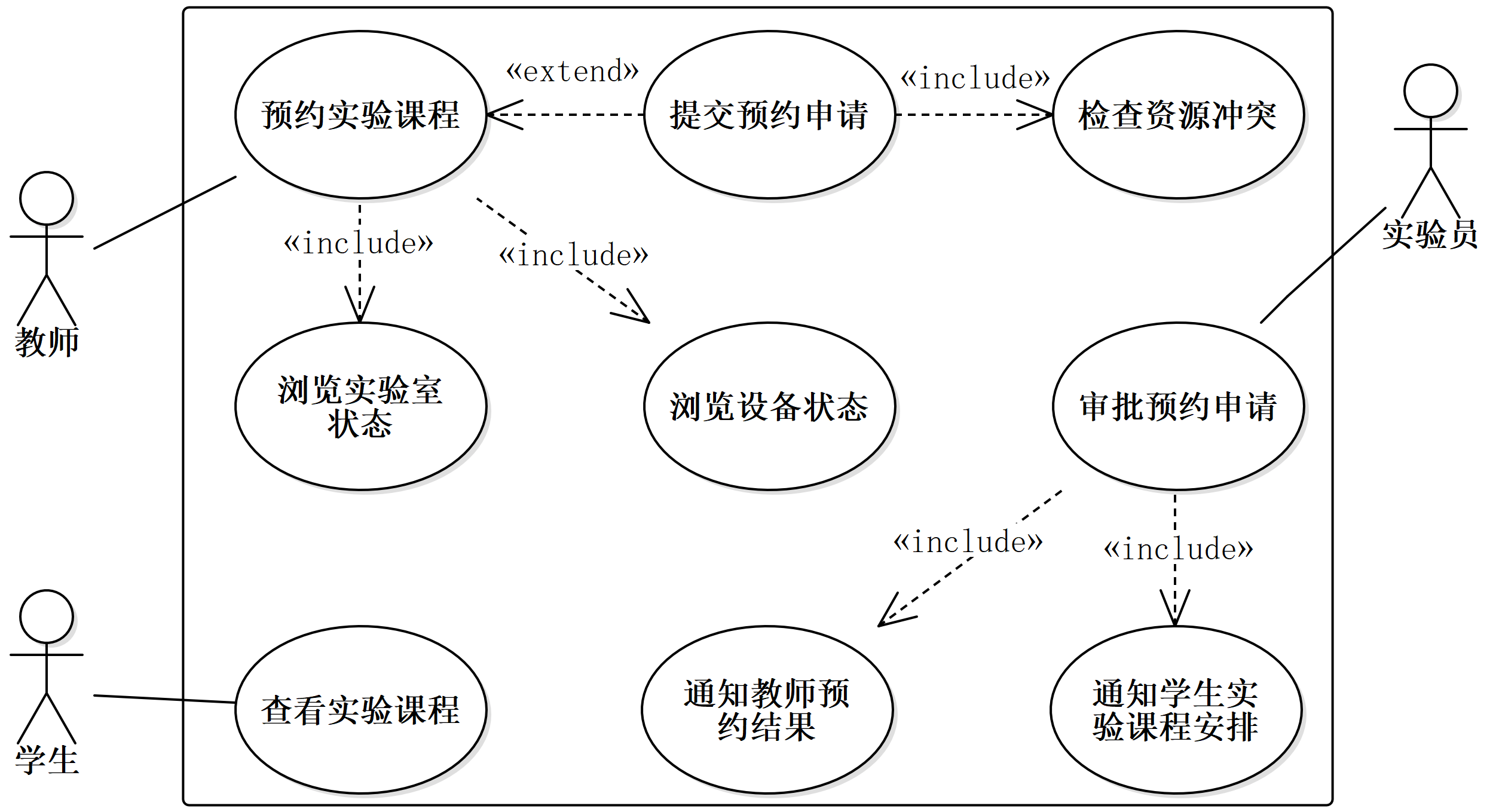- 识别参与者:主要有教师(发起预约请求)、实验员(审批预约申请)、学生(接收预约通知)、系统(处理资源冲突)。