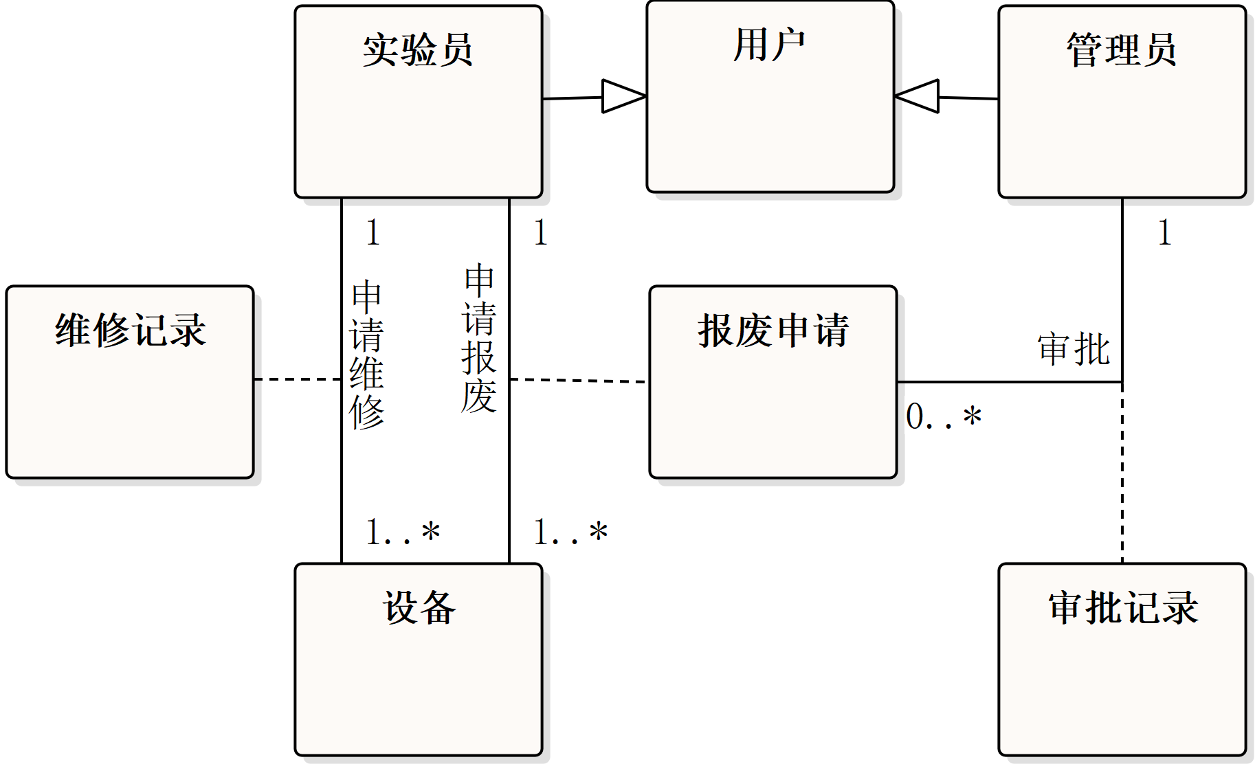 该业务涉及的类包括设备、用户、实验员(继承自用户)、管理员(继承自用户)、维修记录、报废申请、审批记录等。