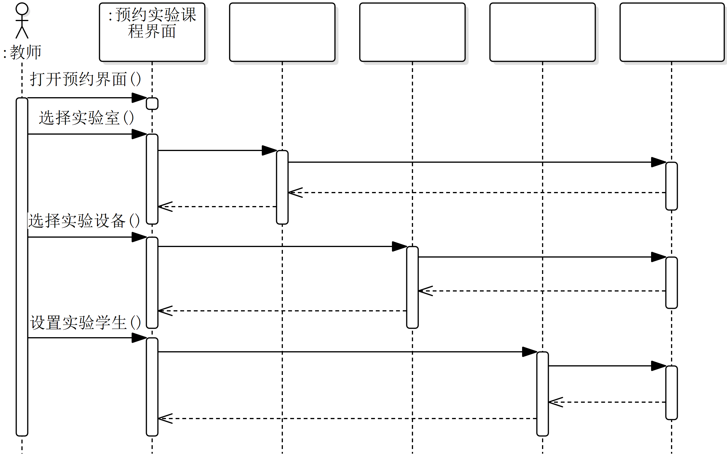 某设计人员分析教师预约实验课程业务的流程后,绘制了该业务的顺序图,但缺失了部分对象及他们之间传递的消息;请参照该顺序图的结构回答以下问题。