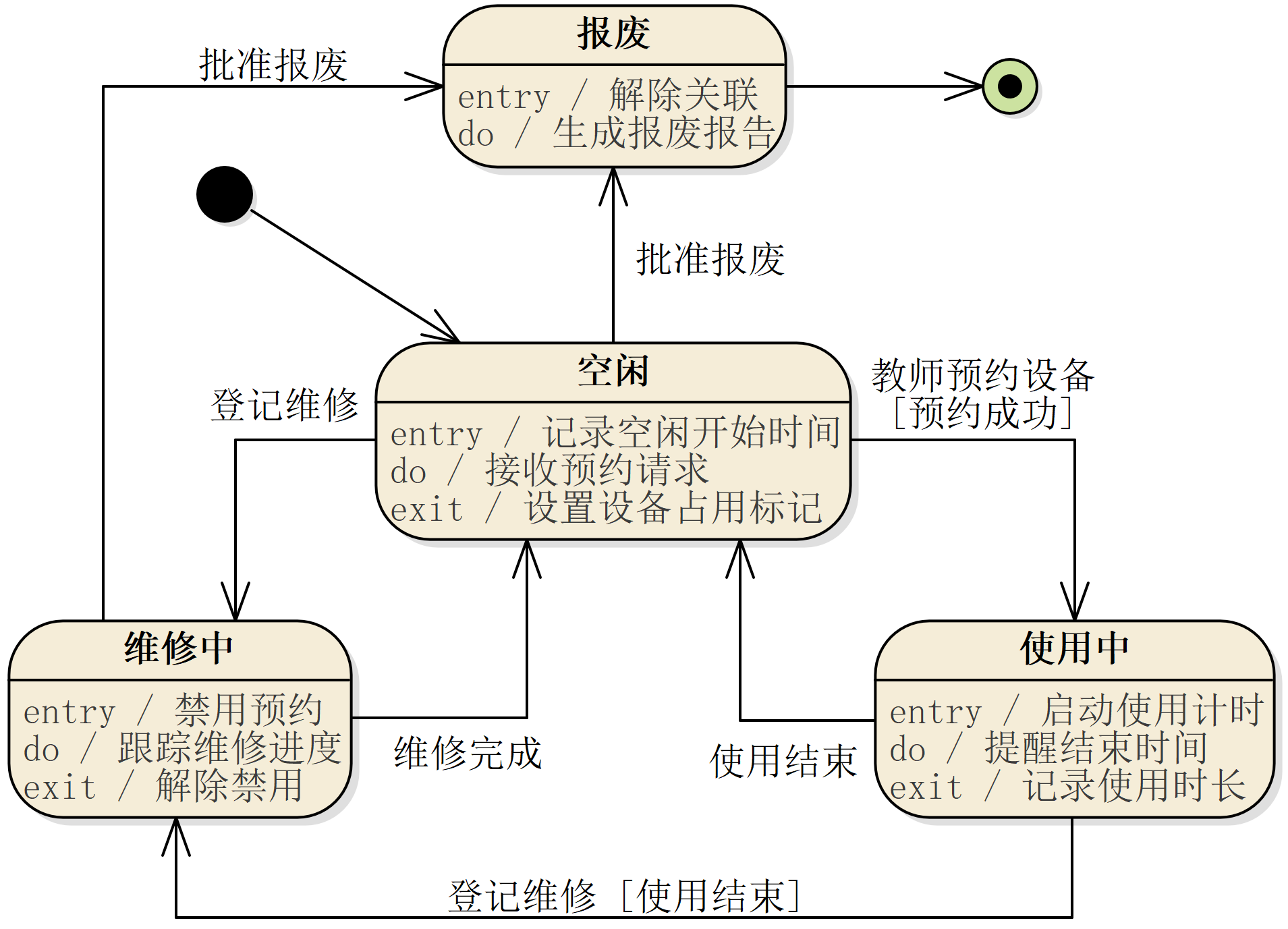 初始状态为空闲,当设备被成功预约使用时,状态由空闲转换为使用中。当设备使用结束 (到达预约结束时或实验员手动结束),状态由使用中转换为空闲,当实验员登记设备维修时,状态由空闲或使用中 (需先结束使用) 转换为维修中,当维修完成,状态由维修中转换为空闲。当管理员审批通过报废申请时,状态由空闲或维修中转换为报废,报废是终止状态。