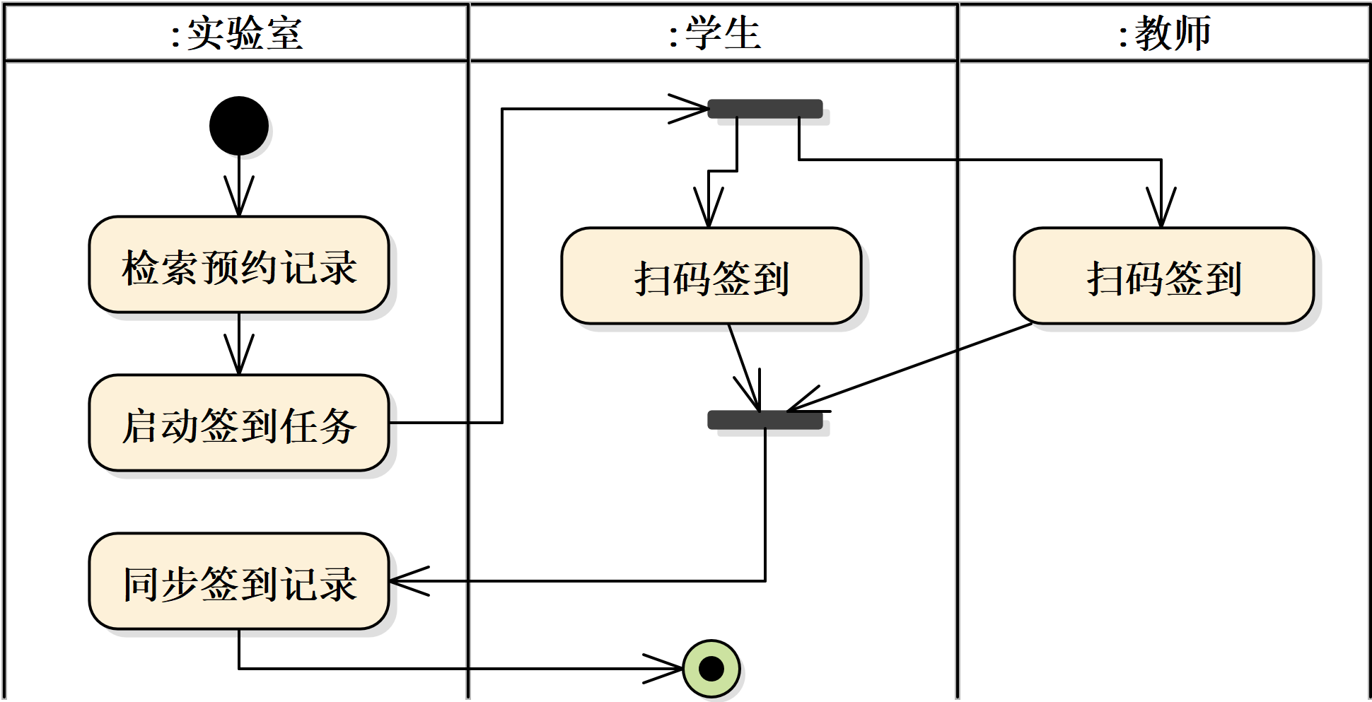 - 活动图:描述“实验教学实施环节”中跨角色的业务活动顺序,通过泳道划分职责