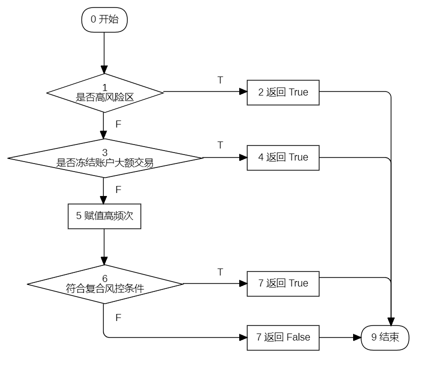请依据基本路径法的思路绘制交易风控检测方法的控制流图(CFG),并计算其环路复杂度、列出独立路径集合。