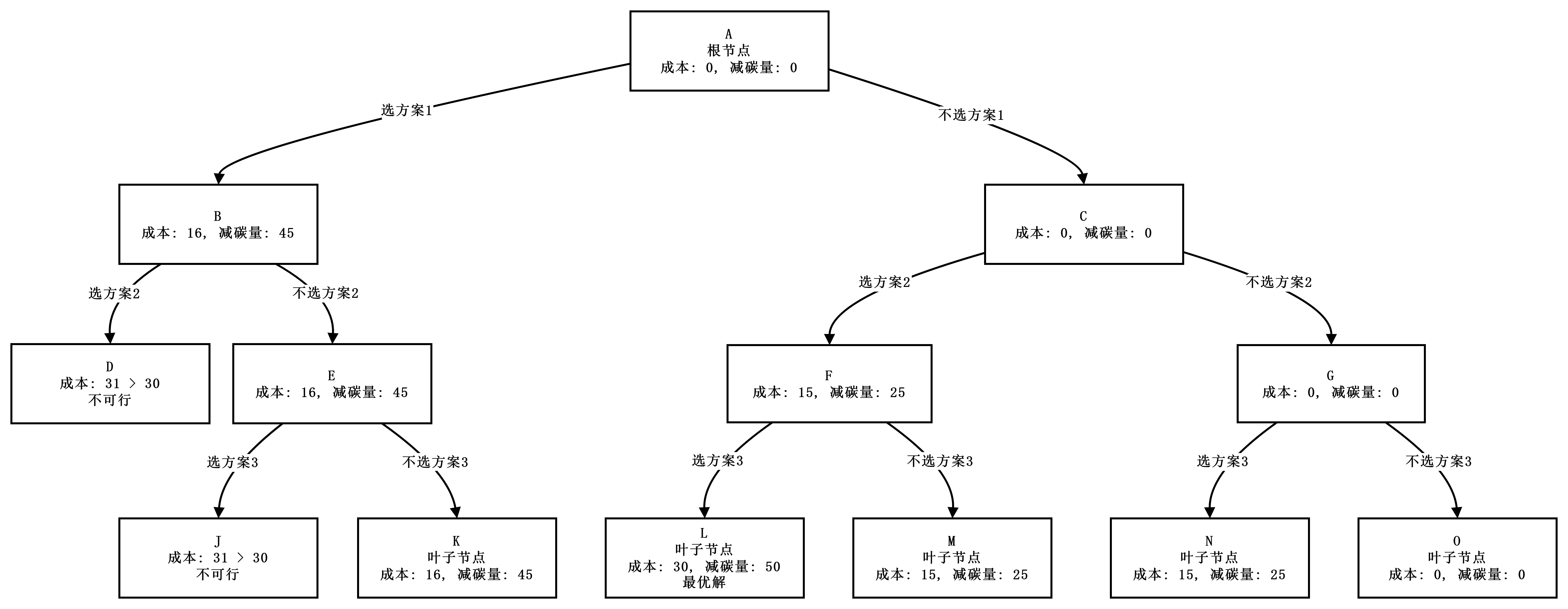 1. 构造解空间树:三层二叉树(左分支=选方案,右分支=不选方案)。