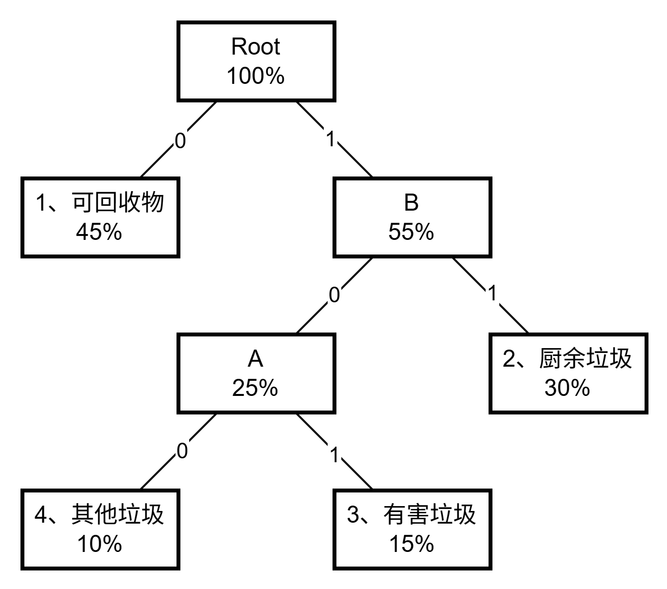 构造哈夫曼树及编码,写出具体的构造过程,写出每种垃圾名称的具体编码。